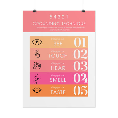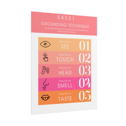 This rolled poster captures a sensory grounding exercise called the 5-4-3-2-1 exercise, pairing vivid pink and orange with a choice of two paper finishes: semi-glossy, or matte - so you can choose the level of texture and sheen that suits your space.